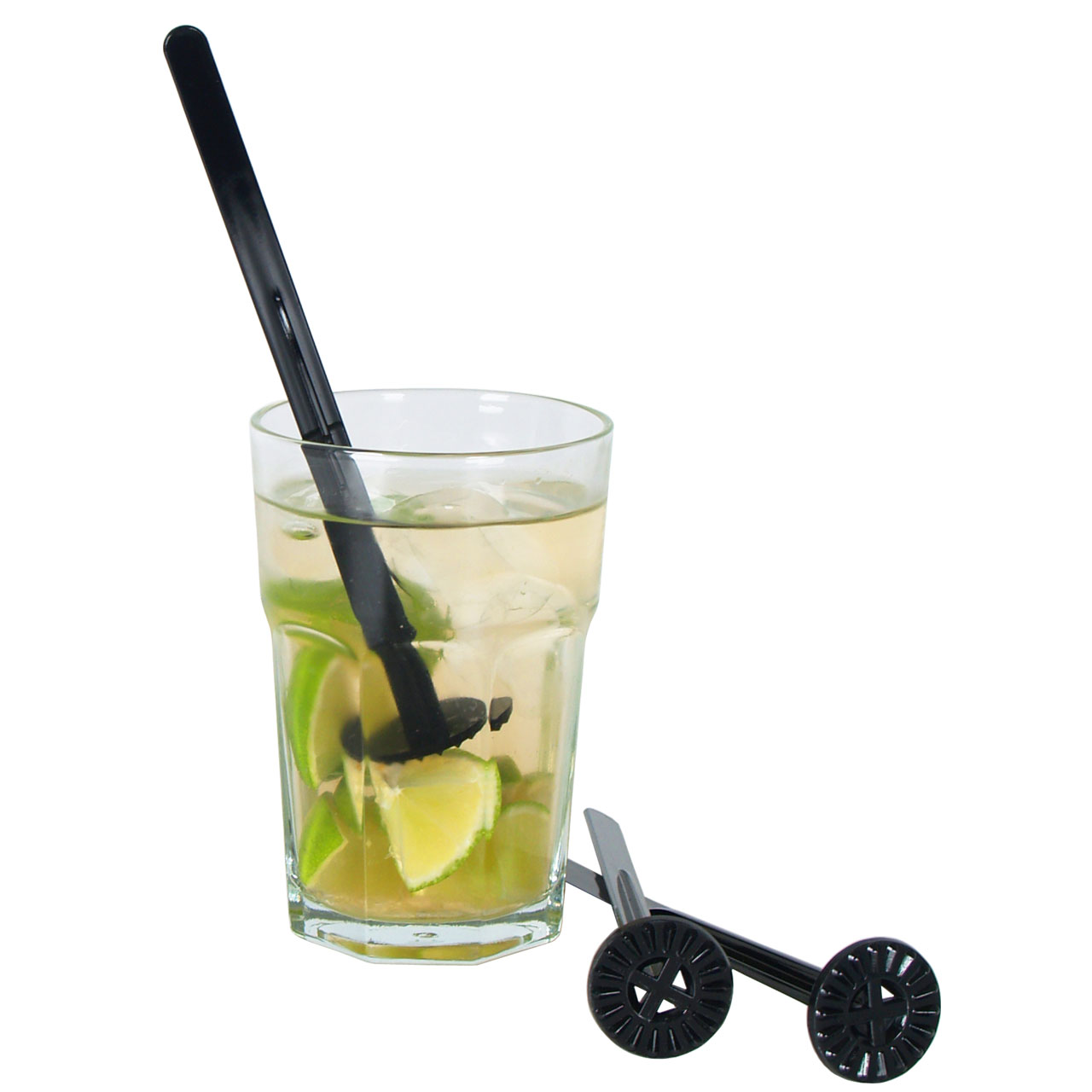 Der Caipi-Klassiker. Rühren, stampfen, mischen. Dieser praktische und coole Rührstab wird als Stamper vor allem beim Caipirinha eingesetzt. Die untere waagerecht stehende Kunststoffscheibe mit kleinen Spitzen ist zum Auspressen der Limettenstücke und zum Vermischen von Crushed-Ice, Zucker und Cachaca ideal. Aber auch in jedem Softdrink eine coole Deko. In Amsterdamer Lokalen steckt dieser Stamper in jedem Getränk. Die 17 cm langen, schwarzen Rührstäbe sind oben schmal und unten als waagerechte Scheibe geformt. Die coolen Stamper Rührstäbe sind als 50er Packung erhältlich.