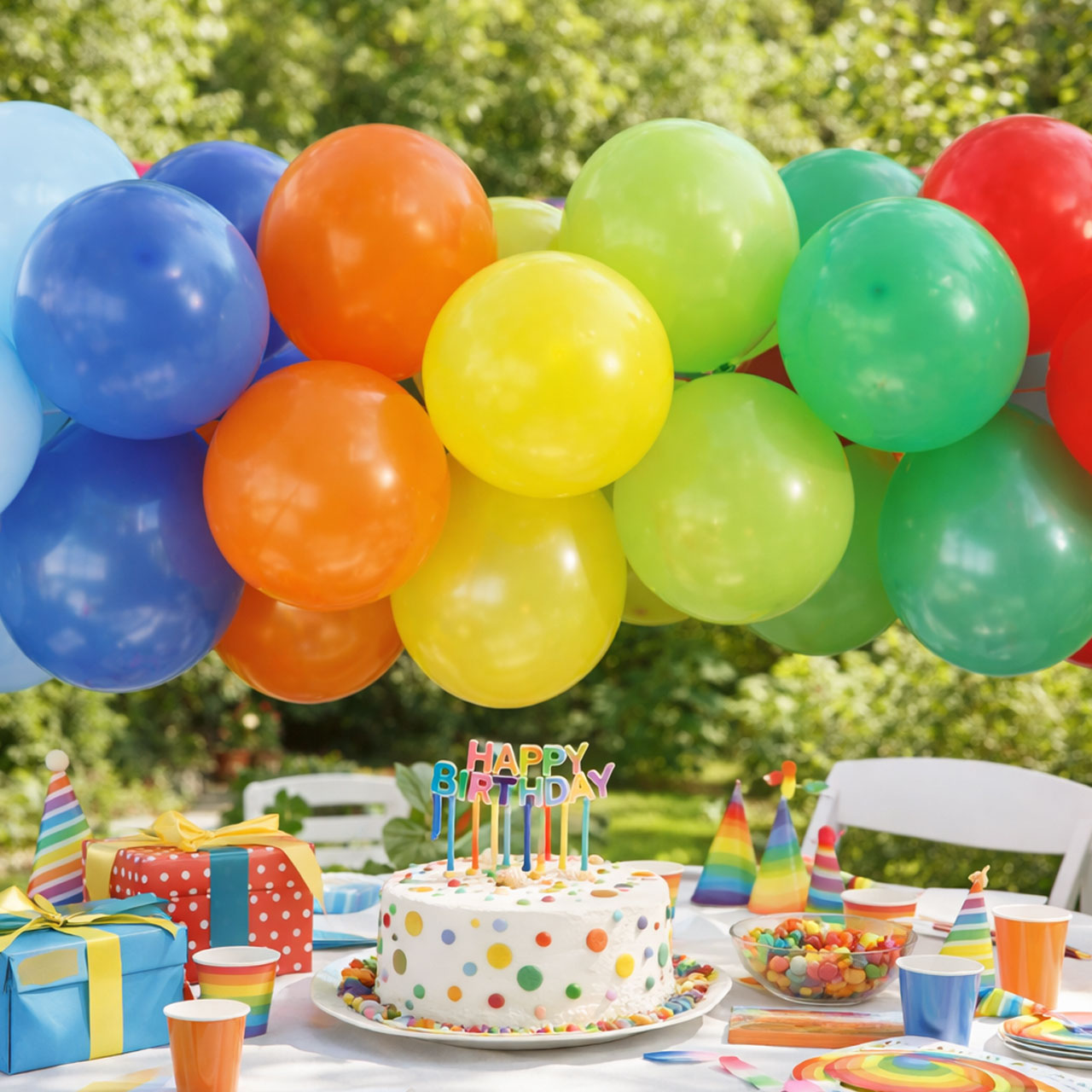 Die große, bunte Luftballongirlande aus 80 verschieden farbigen Luftballons macht was her. Mit einer Luftpumpe ist das Aufblasen schnell erledigt. Die Luftballons werden in 4er Gruppen in beiliegende vorbereitete Papphalterungen geklemmt, die für die richtige Form der Luftballongirlande sorgen. Die 4er Luftballonpakete werden dann auf die beiliegenden dünne Schnur gefädelt - und dann gilt es nur noch einen Platz zu finden, an dem dieses Prachtexemplar hängt.