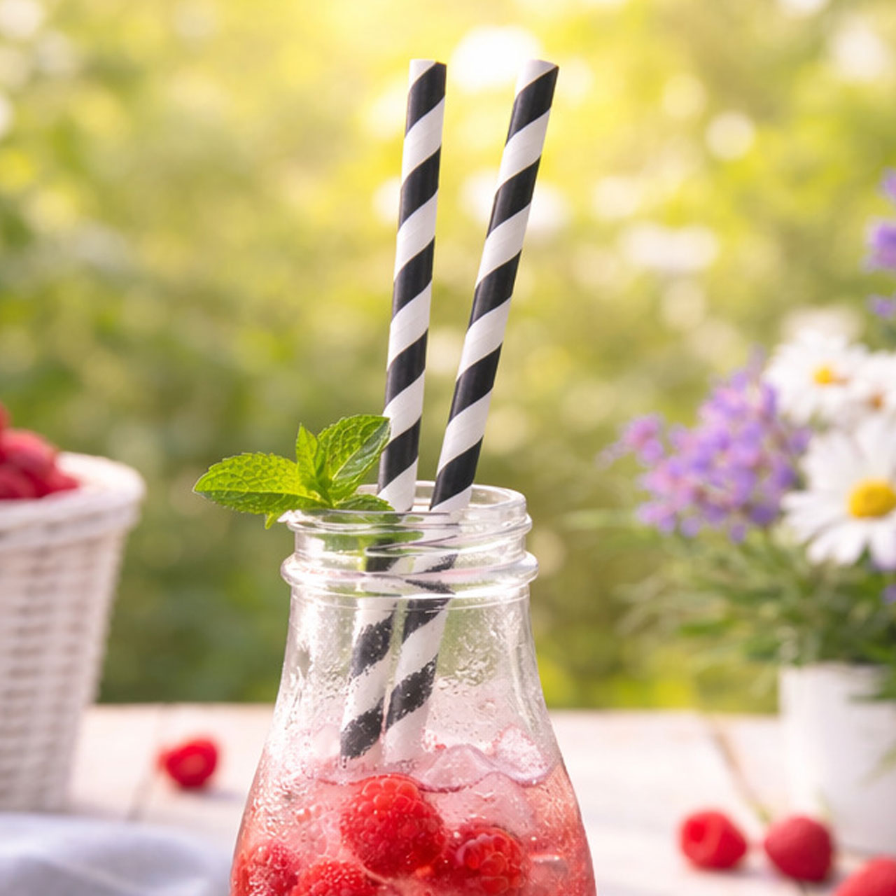 Papier Trinkhalme Ø 0,6 x 20cm, Streifen schwarz-weiß