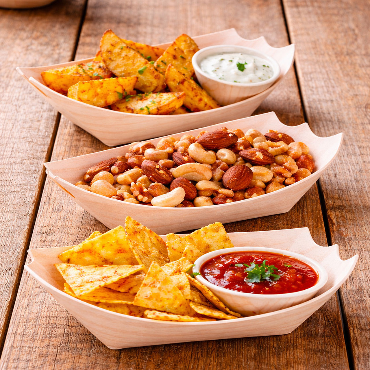 Die umweltfreundlichen Buffet- und Partyhelfer aus Holz sind appetitlich, sehen gut aus und können mit gutem Gewissen entsorgt werden. Kleine Spezialitäten, Tapas, raffinierte Salate oder süße Versuchungen können in diesen kleinen Holzschiffchen optisch ansprechend angerichtet und präsentiert werden. Die Gäste nehmen die mittelgroßen Schälchen samt Inhalt auf einem großen Teller oder direkt in der Hand als Fingerfood mit. Die Holzschiffchen aus ultradünnem Holz sehen ungewöhnlich und toll aus. Sie halten bei dickflüssigen Salatsaucen oder Dips dicht, nicht aber bei Suppe. Die Holz-Schiffchen sind in 3 Größen erhältlich.
